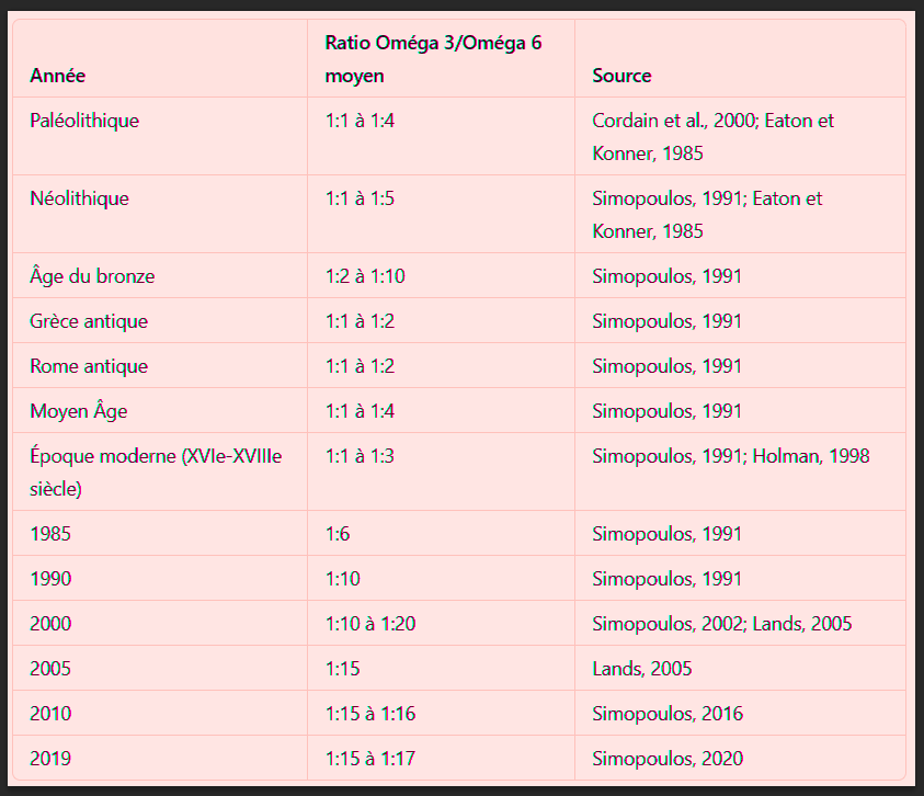 - Dans les régimes occidentaux, ce ratio peut atteindre 20 pour 1, en raison d’une consommation excessive de produits riches en oméga 6