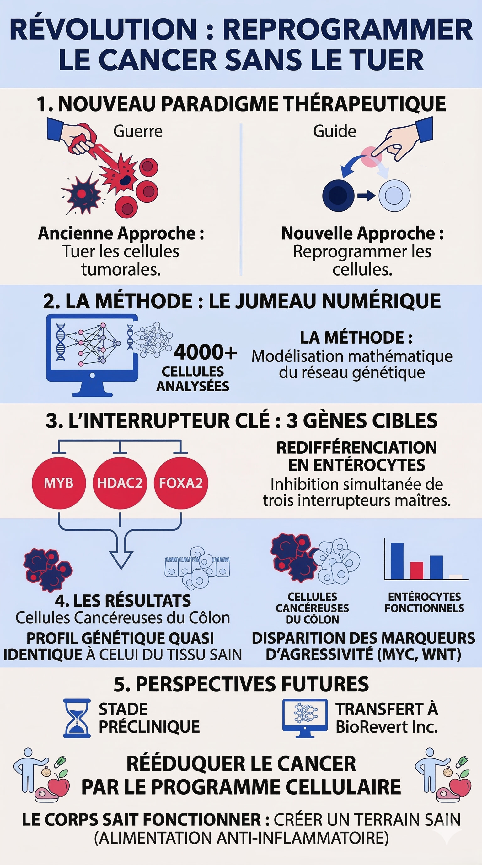 Depuis un siècle, la médecine combat le cancer avec une seule logique : tuer les cellules tumorales. Chimio, radiothérapie, chirurgie, immunothérapie… tout repose sur cette idée. Et ça marche, parfois. Mais avec des dégâts colossaux sur le reste du corps, des résistances qui apparaissent, des récidives qui reviennent.